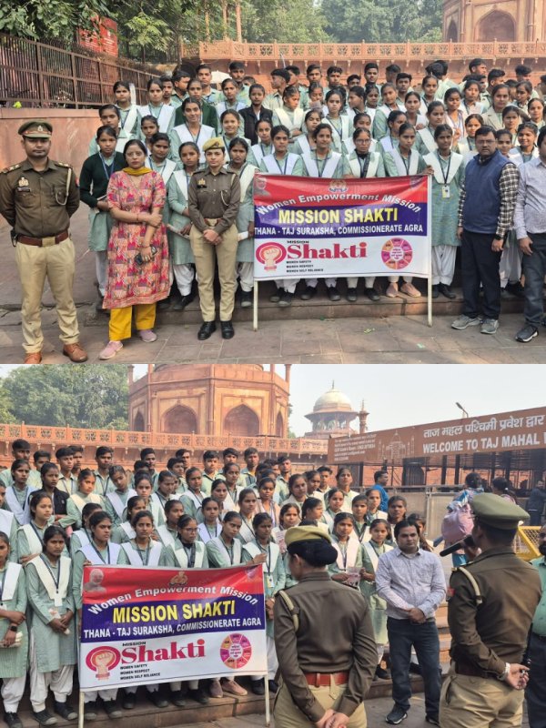 आगरा : पुलिस कमिश्नर दीपक कुमार के निर्देशन में एसीपी ताज सुरक्षा नेतृत्व में एवं प्रभारी निरीक्षक थाना ताज सुरक्षा पर्यवेक्षण में थाना ताज सुरक्षा की त्वरित प्रतिक्रिया दल द्वारा एसपीएस इंटर कॉलेज अलीगढ़ उत्तर प्रदेश से ताजमहल भ्रमण के लिए आए स्कूली छात्राओं एवं महिलाओं को ताज सुरक्षा पुलिस की क्विक रिस्पांस टीम द्वारा स्वागत कर उन्हें ताजमहल भ्रमण के लिए सुखद एवं सुरक्षित वातावरण उपलब्ध कराकर मिशन शक्ति के अंतर्गत महिला सशक्तिकरण एवं मुख्यमंत्री द्वारा महिलाओं के लिए विभिन्न संचालित योजनाओं व हेल्पलाइन नंबर के बारे में आवश्यक जानकारियां देकर उन्हें जागरूक किया गया। पुलिस टीम में उप निरीक्षक शुभम कुमार वर्मा,आरक्षी आशु महिला आरक्षी रितु शामिल रहे।
