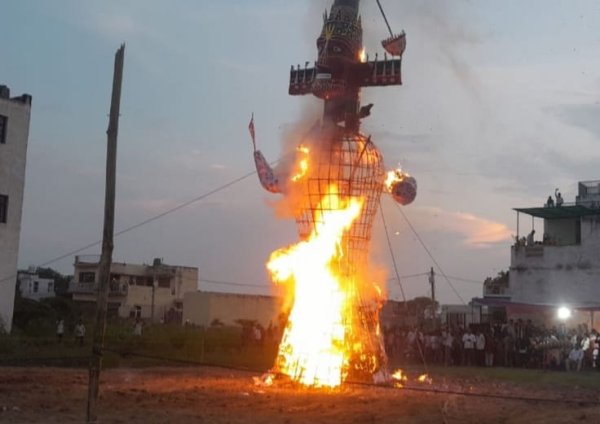 इगलास : असत्य पर सत्य की जीत व अधर्म पर धर्म की विजय हुई। श्री राम का लंकापति राजा रावण की नाभि में अग्नि वाण लगते ही धूं धूं कर जल उठा अधर्मी रावण का पुतला। रावण दहन मेला में कोतवाली प्रभारी निरीक्षक नरेंद्र यादव व अपराध निरीक्षक सुभाष सिंह कठेरिया द्वारा शांति व्यवस्था बनाए रखने के लिए लगाया गया भारी पुलिस बल, के रहते किसी भी हुड़दंगी द्वारा हुड़दंग नहीं किया गया।