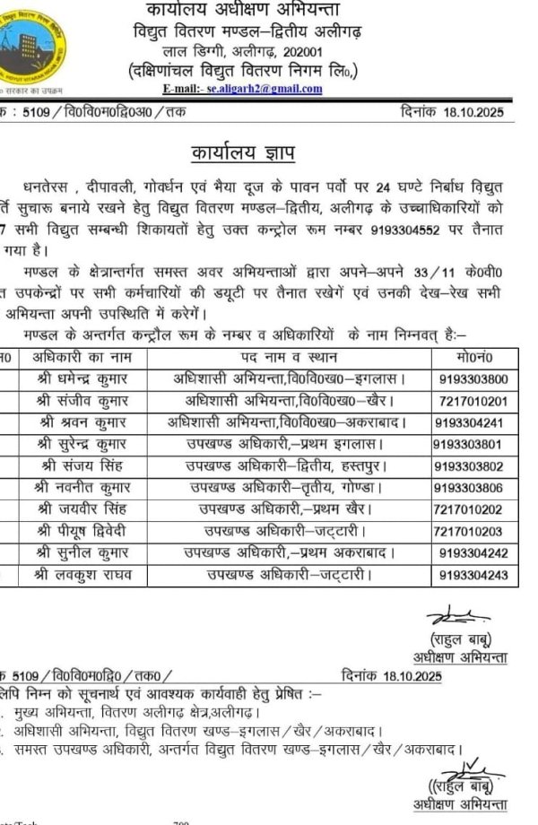 अलीगढ़ : धनतेरस, दीपावली, गोवर्धन एवं भैया दूज जैसे प्रमुख पर्वों के दौरान लोगों को निर्बाध विद्युत आपूर्ति उपलब्ध कराने के उद्देश्य से विद्युत वितरण मण्डल-द्वितीय, अलीगढ़ (दक्षिणांचल विद्युत वितरण निगम लिमिटेड) ने विशेष नियंत्रण व्यवस्था लागू की है।