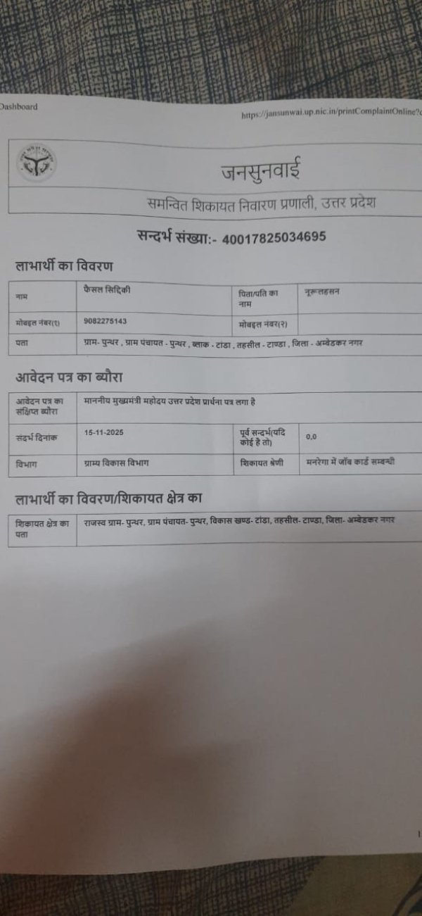 बताया गया कि ग्राम सभा पुन्थर में कुल कितने जॉब कार्ड बनाए गए, इसकी प्रमाणित सूची उपलब्ध कराई जाए। इसी क्रम में अदनान सिद्दिकी नामक व्यक्ति का मामला उठाया गया है, जिनके पास कई बैंक कार्ड और महंगे मोबाइल होने के बावजूद उनका जॉब कार्ड बना हुआ है, जिसे शिकायतकर्ता ने फर्जी बताते हुए इसकी जांच की मांग की है।
