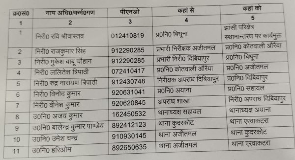 औरैया : पुलिस अधीक्षक औरैया अभिजित आर शंकर ने फिर चलाई तबादला एक्सप्रेस, निरीक्षकों / उपनिरीक्षकों के कार्य क्षेत्र में किया फेरबदल। ललितेश नारायण त्रिपाठी प्रभारी निरीक्षक कोतवाली औरैया को प्रभारी कोतवाली अजीतमल की दी जिम्मेदारी। अजीतमल कोतवाली प्रभारी की जिम्मेदारी देख रहे निरीक्षक राजकुमार सिंह को औरैया कोतवाली प्रभारी की दी जिम्मेदारी। थाना प्रभारी दिबियापुर की जिम्मेदारी देख रहे निरीक्षक मुकेश बाबू चौहान को कोतवाली प्रभारी विधूना की दी जिम्मेदारी। इसके साथ ही निरीक्षक रुद्र नारायण त्रिपाठी को अपराध निरीक्षक दिबियापुर को थाना प्रभारी दिबियापुर की दी जिम्मेदारी। कोतवाली प्रभारी विधूना की जिम्मेदारी देख रहे निरीक्षक रवि श्रीवास्तव का झांसी परिक्षेत्र स्थानान्तरण हो जाने के कारण उन्हें किया कार्य मुक्त। उप निरीक्षक अजय कुमार को थाना अध्यक्ष सहायल से हटाकर थाना अध्यक्ष अयाना की दी जिम्मेदारी । माना जा रहा है कि जनपद की कानून व्यवस्था को और बेहतर करने के उद्देश्य से पुलिस अधीक्षक औरैया अभिजित आर शंकर ने फिर यह बड़ा फेरबदल किया है।