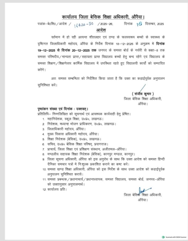 औरैया - कड़ाके की ठंड और शीतलहर के चलते जनपद में स्कूलों को लेकर बड़ा आदेश जारी। जिलाधिकारी औरैया के निर्देश पर 19 दिसंबर से कल 20 दिसंबर 2025 तक नर्सरी से कक्षा 8 तक के सभी विद्यालय रहेंगे बंद। आदेश परिषदीय, मान्यता प्राप्त व सहायता प्राप्त सभी विद्यालयों पर लागू। बच्चों के लिए अवकाश रहेगा, जबकि शिक्षक एवं शिक्षणेत्तर कर्मी विद्यालय में उपस्थित रहेंगे। शिक्षकों द्वारा विद्यालय में अन्य शैक्षणिक व प्रशासनिक कार्य संपादित किए जाएंगे। आदेश जिला बेसिक शिक्षा अधिकारी औरैया संजीव कुमार द्वारा किया गया जारी। इसके साथ ही शीत लहर से बचाव के लिए एडवाइजरी की गई जारी, एडवाइजरी के मध्यम से बताया गया क्या करें,क्या न करें।