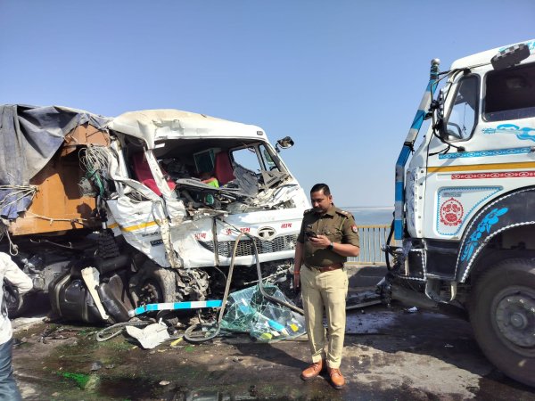बैंदाघाट यमुना पुल पर दो डंफरों की आमने-सामने टक्कर