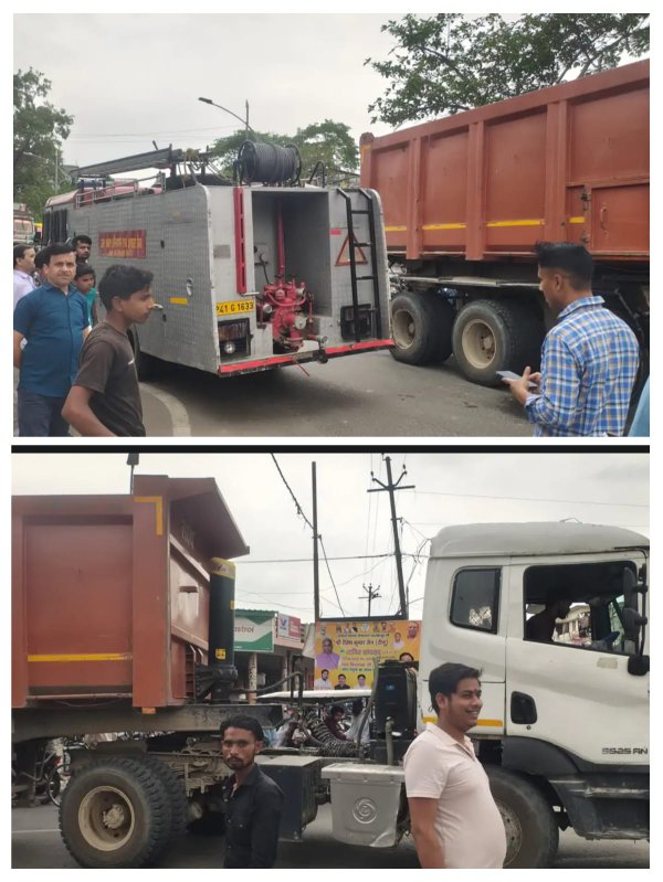 आग बुझाने जा रही फायर ब्रिगेड की गाडी को मौरंग लड़े डम्पर ने मारी टककर