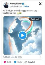 अक्षय कुमार ने एक्स (पूर्व में ट्विटर) पर हिंदी में देशप्रेम से भरा संदेश साझा किया। “जय हिंद” और “जय भारत” के उद्घोष के साथ उनका पोस्ट पूरे उत्साह और गर्व की भावना को दर्शाता नज़र आया।