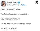 सुनील शेट्टी ने स्वतंत्रता के साथ जुड़ी ज़िम्मेदारियों की बात करते हुए कहा कि गणतंत्र का सम्मान केवल शब्दों से नहीं, बल्कि कर्मों से होना चाहिए।