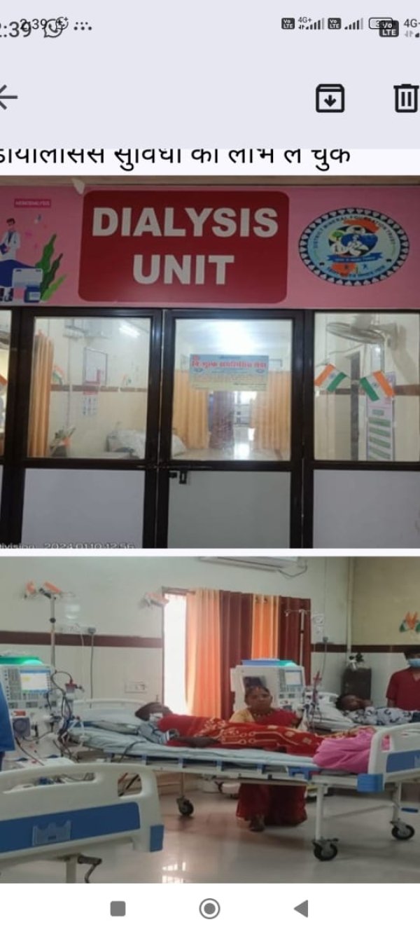 हैं। प्रारंभ से अभी तक लगभग 10305 डायलिसिस सेशन हो चुके है। प्रतिमाह लगभग 300 बार डायलिसिस किया जा रहा है। वर्तमान में 27एक्टीव मरीज हैं।