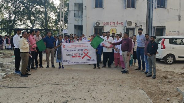 छोटाउदेपुर- चीफ डिस्ट्रिक्ट हेल्थ ऑफिसर डॉ. पॉल वसावा की सूचना और मार्गदर्शन में, 1 दिसंबर को वर्ल्ड एड्स डे के मौके पर, नेशनल एड्स कंट्रोल प्रोग्राम और डिस्ट्रिक्ट ट्यूबरकुलोसिस सेंटर, छोटा उदयपुर की संयुक्त पहल पर, डिस्ट्रिक्ट ट्यूबरकुलोसिस ऑफिसर डॉ. बी.एम. चौहान ने कम्युनिटी में HIV/AIDS के बारे में अवेयरनेस फैलाने के लिए एक अवेयरनेस रैली निकाली। इस मौके पर RCHO डॉ. मुकेश पटेल, डिस्ट्रिक्ट ट्यूबरकुलोसिस सेंटर, छोटा उदयपुर के मेडिकल ऑफिसर डॉ. कुलदीप शर्मा और डिस्ट्रिक्ट TB HIV कोऑर्डिनेटर वालसिंगभाई राठवा, ART सेंटर की मेडिकल ऑफिसर डॉ. वीना राठवा के साथ-साथ नर्सिंग कॉलेज की प्रिंसिपल भावनाबेन जोशी, अर्बन हेल्थ सेंटर के हेल्थ सुपरवाइजर राजूभाई राठवा, डिस्ट्रिक्ट ICTC काउंसलर संजयभाई राठवा, प्रवीणभाई पटेल, अतुलभाई कोल्चा, आकाश वालंद और उत्थान लोक विज्ञान सेंटर, छोटाउदेपुर की सोनलबेन राठवा, विकल्प स्त्री संगठन के ईश्वरभाई राठवा, मोड NGO के रमनभाई राठवा, विहान A+ के वेचातभाई राठवा, नर्सिंग कॉलेज के स्टूडेंट्स, हेल्थ वर्कर और आशा बहनों समेत कर्मचारी उपस्थित हुए।