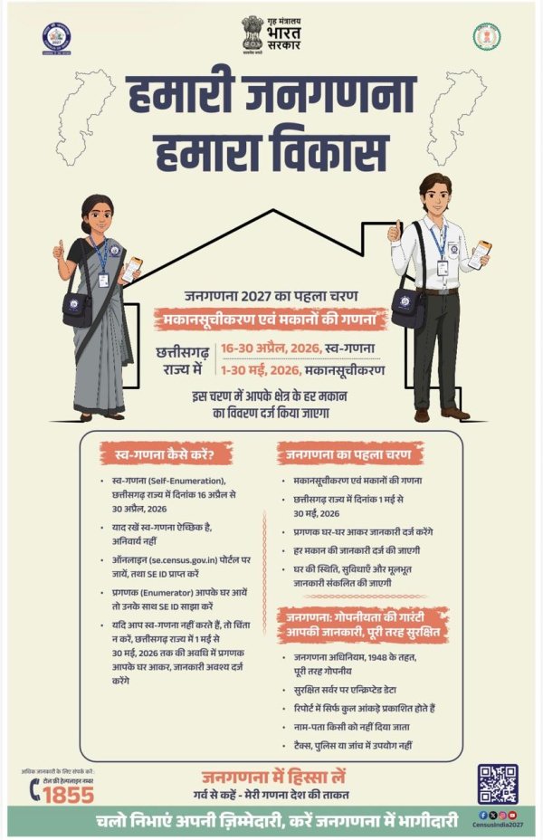 दंतेवाड़ा : देशव्यापी जनगणना 2027 के तहत छत्तीसगढ़ राज्य में प्रथम चरण की प्रक्रिया शुरू हो रही है। इस चरण में मकान सूचीकरण एवं मकानों की गणना की जाएगी, जिसमें राज्य के प्रत्येक घर का विस्तृत विवरण दर्ज किया जाएगा। यह कार्य दो चरणों में संपन्न होगा-स्व-गणना और प्रगणकों द्वारा घर-घर सर्वे। राज्य में 16 अप्रैल से 30 अप्रैल 2026 तक स्व-गणना की सुविधा उपलब्ध रहेगी, जो पूर्णतः ऐच्छिक है। इच्छुक नागरिक ऑनलाइन पोर्टल (se-census.gov.in) पर जाकर स्वयं अपनी जानकारी दर्ज कर सकते हैं और एक सी आईटी प्राप्त कर सकते हैं। प्रगणक के घर आने पर नागरिक इस प्क् को साझा कर सकते हैं।