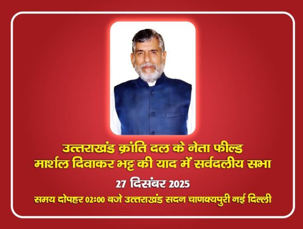 नई दिल्ली : उत्तराखंड क्रांति दल के वरिष्ठ नेता और राज्य आंदोलन के प्रमुख चेहरे रहे फील्ड मार्शल दिवाकर भट्ट की स्मृति में 27 दिसंबर को नई दिल्ली स्थित उत्तराखंड सदन में सर्वजनिन श्रद्धांजलि सभा आयोजित की जाएगी।