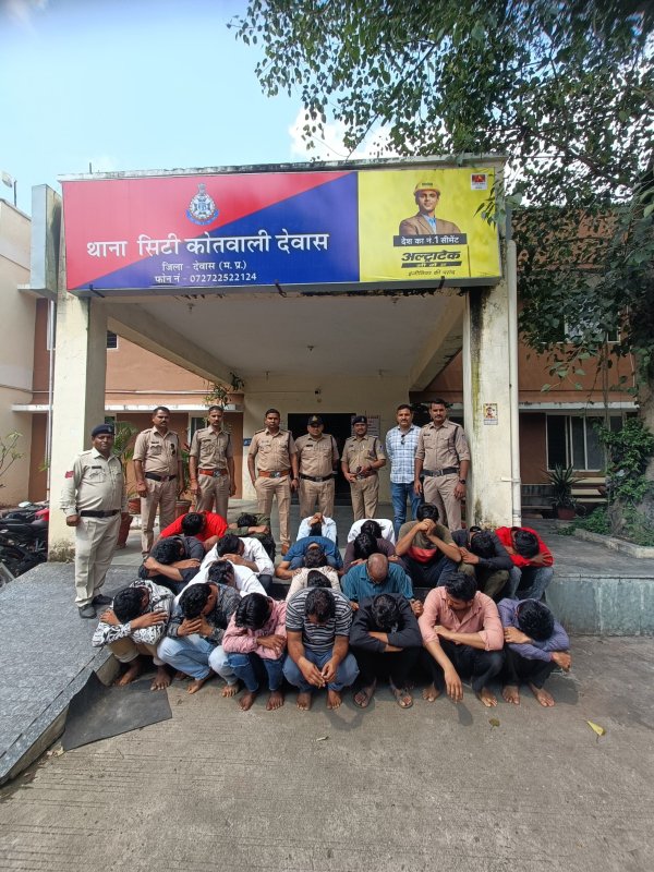 देवास : बुधवार की दरमियानी रात को थाना कोतवाली पुलिस को रात्रि गश्त के दौरान विश्वसनीय मुखबिर से सूचना प्राप्त हुई कि जोशीपुरा मंदिर के पीछे खाली प्लाट पर कुछ व्यक्ति हार-जीत का दांव लगाकर मांग-पत्ती (ताश) का जुआ खेल रहे हैं । सूचना की गंभीरता को देखते हुए तत्काल वरिष्ठ अधिकारियो को अवगत कराया गया । पुलिस अधीक्षक देवास पुनीत गेहलोद द्वारा मुखबिर द्वारा बताये गये स्थान पर दबिश देकर आरोपियो को गिरफ्तार कर सख्त कार्यवाही हेतू निर्देशित किया गया । जिस पर से अतिरिक्त पुलिस अधीक्षक (शहर) जयवीर सिंह भदौरिया के मार्गदर्शन में नगर पुलिस अधीक्षक देवास सुमित अग्रवाल के निर्देशन में थाना प्रभारी कोतवाली श्यामचन्द्र शर्मा के नेतृत्व में 03 विशेष पुलिस टीमों का गठन कर मुखबिर द्वारा बताए गए स्थान पर दबिश दी गई,जहां कुछ व्यक्ति ताश की गड्डी पर रुपये का दांव लगाकर जुआ खेलते पाए गए । पुलिस को देखकर कुछ व्यक्ति मौके से भागने लगे जिन्हें घेराबंदी कर कुल 21 आरोपियों को गिरफ्तार कर आरोपियो के कब्जे से कुल ₹ 8,230/- नगद,52 ताश के पत्ते का मश्रुका जप्त कर आरोपियो के विरूद्ध थाना कोतवाली में अपराध क्रमांक 714/2025,715/2025,716/2025,717/2025 धारा 13 जुआ अधिनियम का अपराध पंजीबद्ध विवेचना में लिया जाकर अग्रिम वैधानिक कार्यवाही की जा रही है ।