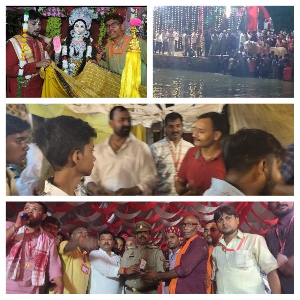 पूजा-अर्चना और भारमल के पश्चात भंडारे का आयोजन किया गया, जिसमें नगरवासी प्रसाद ग्रहण कर माता रानी की आराधना में शामिल हुए। इसके बाद विसर्जन शोभायात्रा पूरे नगर में उत्साहपूर्वक निकाली गई। भक्तिभाव से ओत-प्रोत लोग झूले और डीजे की मधुर धुनों के बीच माता रानी की प्रतिमाएँ लेकर पोखरे की ओर बढ़े।