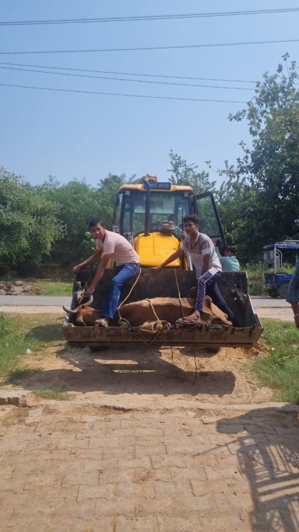 जलेसर में बीमार गौ माता की सेवा में जुटा हिंदू एकता समूह,जेसीबी से कराया गौशाला तक पहुंचाव