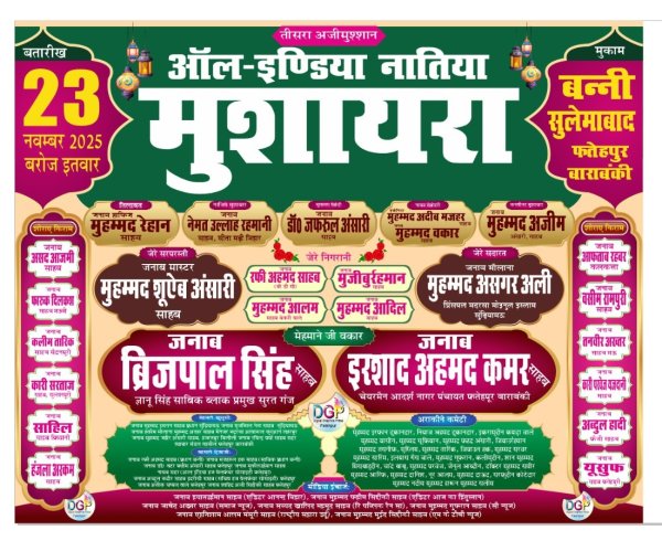 23 नवंबर को कुल हिन्द नातिया मुशायरा बन्नी सूलेमाबाद में