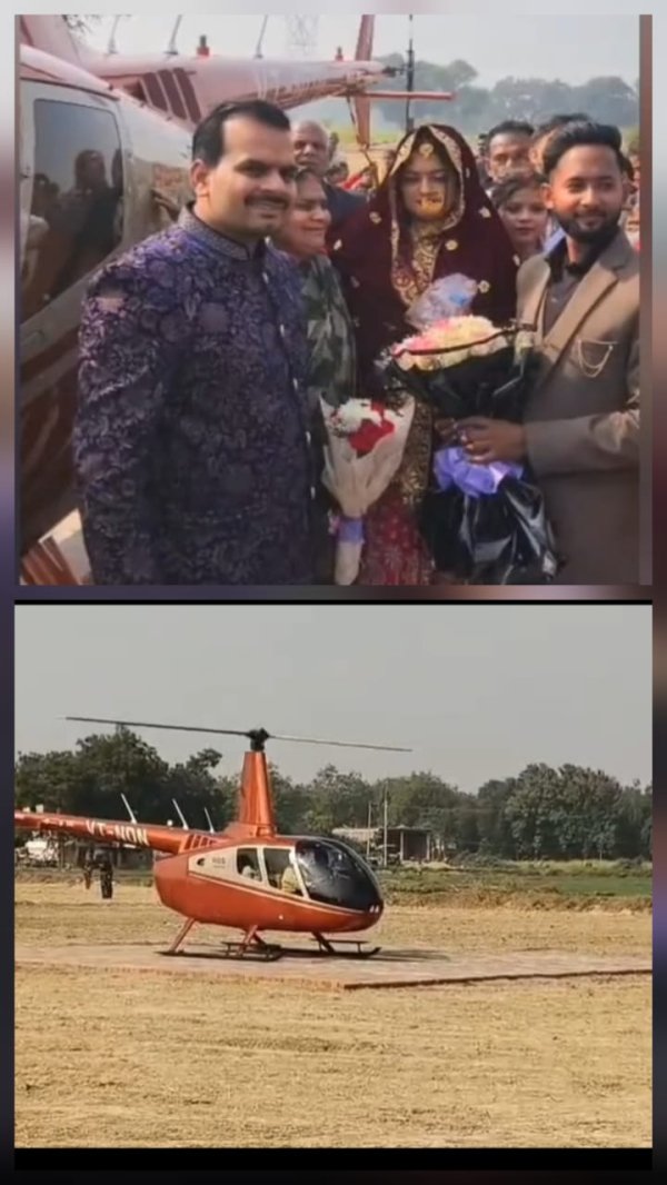 दूल्हा–दुल्हन की “हेलीकॉप्टर विदाई” बनरसी गाँव में उतरा चॉपर, देखने दौड़ी भारी भीड़