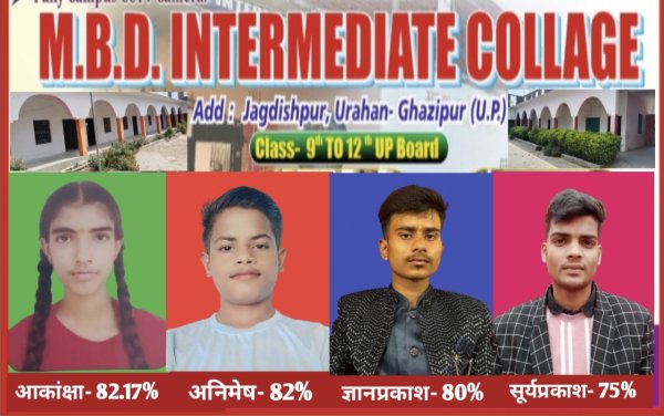कासिमाबाद : यूपी बोर्ड परीक्षा 2026 के घोषित परिणाम में एमबीडी इंटरमीडिएट कॉलेज ने अपना परचम लहरा दिया है। अच्छे अंकों से उत्तीर्ण हो कर कालेज के बच्चों ने अपने स्कूल एवं परिवार के साथ-साथ जिले का भी नाम रोशन किया है। इसके लिए प्रधानाचार्य ने सभी स्टाफ को धन्यवाद दिया। हर साल की भांति इस वर्ष भी एमबीडी इंटरमीडिएट कॉलेज जगदीशपुर उरहां का रिजल्ट 100 प्रतिशत रहा है। जिसमें आकांक्षा गुप्ता, अनिमेष राजभर, ज्ञानप्रकाश पाण्डेय, सूर्यप्रकाश पांडेय ने टाप टेन मे अपना जगह बनाया है तो वहीं फलक खातून, आयुष यादव, राधेमोहन, काजल बिन्द, राधिका बिन्द, काजल यादव, रानी कुमारी, अनुप्रिया श्रीवास्तव, अल्कमा सहित सैकड़ों छात्र-छात्राओं ने जिले मे अपने परिवार सहित विद्यालय का नाम रोशन किया है। प्रधानाचार्य गोपाल जी पांडेय ने सभी छात्र-छात्राओं को बधाई देते हुए कहा कि विद्यालय के समस्त अध्यापकों द्वारा सभी विषयों की जबरदस्त तैयारी कराई गई थी इसके लिए हमारे सभी अध्यापक बधाई के पात्र हैं। उन्होंने क्षेत्रवासियों से अपील करते हुए कहा कि अपने बच्चों की अच्छी शिक्षा तथा अच्छे कैरियर के लिए स्कूल भेजें। हम उनके उम्मीद से अधिक बेहतर रिजल्ट देने का प्रयास करेंगे।