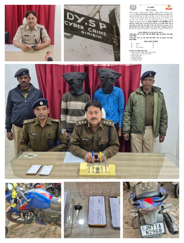 गिरिडीह - बीते 17 दिसम्बर बुधवार को पुलिस अधीक्षक गिरिडीह को प्रतिबिम्ब पोर्टल के माध्यम से सूचना प्राप्त हुई की ताराटाड़ जाने वाली मुख्य सड़क स्थित उसरी नदी पुल के पास झाड़ी में कुछ साइबर अपराधियों द्वारा फोन के माध्यम से ठगी किया जा रहा है। उपरोक्त सूचना के आधार पर गिरिडीह साइबर डीएसपी आबिद खान के नेतृत्व में एक छापामारी दल का गठन किया गया। छापामारी दल के द्वारा त्वरित कार्रवाई करते हुए कुल दो साइबर अपराधियों को गिरफ्तार किया गया। गिरफ्तार अभियुक्तों ने अपने स्वीकारोक्ति बयान में बताया कि ये फोनपे, ऑनलाइन पेमेंट एप्प गुगल पे पर रेन्डम मोबाइल नम्बर डाल कर UPI लिंक एकांउट मिलने पर उस मोबाइल नं. पर कॉल करके अपने झासे में लेकर ठगी का काम करते है एवं Lotus Ne नाम के ऑनलाईन गेमिंग एप्प के माध्यम से साइबर ठगी के रकम को अपने खाते में विड्रॉ किया करते है। इस संदर्भ में गिरिडीह साइबर थाना में कांड सं. 41/2025 दिनांक 17.12.2025 दर्ज किया गया है।