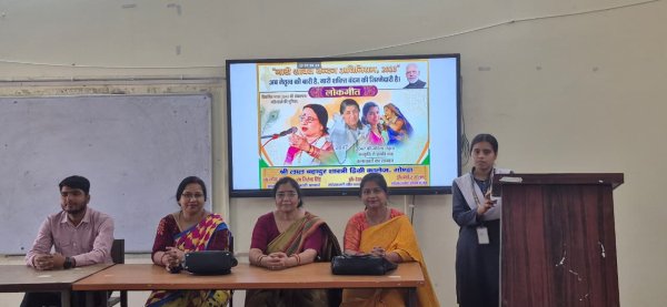 गोंडा : उच्च शिक्षा विभाग के निर्देशानुसार नारी शक्ति वंदन अधिनियम 2023 के व्यापक प्रचार-प्रसार हेतु मिशन शक्ति इकाई के नेतृत्व में विकसित भारत 2047 की संकल्पना महिलाओं की भूमिका विषय पर लोकगीत कार्यक्रम का आयोजन प्रभारी प्रचार प्रोफेसर जितेंद्र सिंह के मार्गदर्शन में आयोजित किया गया।कार्यक्रम में संयोजक डॉक्टर रेखा शर्मा ने नारी शक्ति वंदन अधिनियम के उद्देश्यों पर प्रकाश डालते हुए देश के विकास में महिलाओं की भूमिका पर प्रकाश डाला। मंच संचालन डॉक्टर प्रियंका श्रीवास्तव ने किया जबकि धन्यवाद ज्ञापन डॉक्टर स्मृति शिशिर ने किया। उक्त अवसर पर प्रियांशी सिंह, वर्षा, सौम्या पांडे, दिव्यांशी उपाध्याय एवं रंजिता यादव ने मधुर एवं सुरीली आवाज में लोकगीत प्रस्तुत कर सभी को मंत्रमुग्ध किया। कार्यक्रम में डॉक्टर संजय कुमार, कृष्णमोहन त्रिपाठी, ड्रिंकल यादव एवं अमित दूबे का सहयोग सराहनीय रहा।