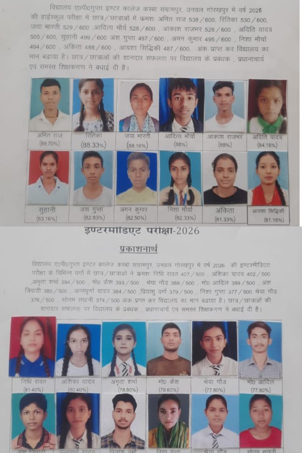 गोरखपुर - नगर पंचायत कस्बा संग्रामपुर उनवल स्थित ए.पी गुप्ता इंटर कालेज के छात्रों ने यूपी बोर्ड की परीक्षा में अव्वल आकर लहराया अपना और अपने विद्यालय का परचम। जिसमें हाईस्कूल में अव्वल अमित राज 89.70%,रितिका 88.30%, जया भारती 88.16%,आदित्य मौर्या 88%,आकाश राजभर 88%,अदिति यादव 84.16%,सुहानी 83.19%,अंश गुप्ता 82.83%,अमन कुमार 82.50%,निशा मौर्या 82.33% अंकिता 81.33%,आयशा सिद्दकी 81.16% रही।