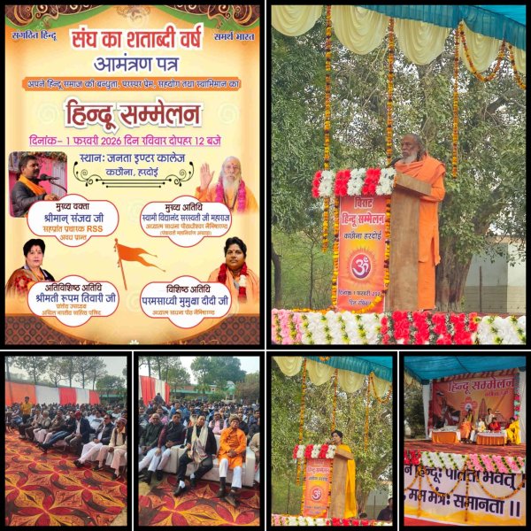 हरदोई : हरदोई जिले के कछौना स्थित जनता इंटर कॉलेज के प्रांगण में। राष्ट्रीय स्वयंसेवक संघ (RSS) के शताब्दी वर्ष के उपलक्ष्य में एक भव्य 'हिन्दू सम्मेलन' का आयोजन किया गया है। केसरिया ध्वजों और 'जय श्री राम' के उद्घोष से पूरा वातावरण भक्तिमय और राष्ट्रभक्ति के रंग में रंगा नजर आ रहा है। इस कार्यक्रम की गरिमा बढ़ाने के लिए कई आध्यात्मिक और सामाजिक विभूतियाँ मंच पर मौजूद रहीं। कार्यक्रम के मुख्य वक्ता, RSS के सहप्रांत प्रचारक श्रीमान संजय जी ने अपने संबोधन में हिंदू समाज की एकजुटता, समरसता और स्वाभिमान पर जोर दिया। उन्होंने संघ के 100 वर्षों के गौरवशाली सफर और राष्ट्र निर्माण में हिंदू समाज की भूमिका को रेखांकित किया।