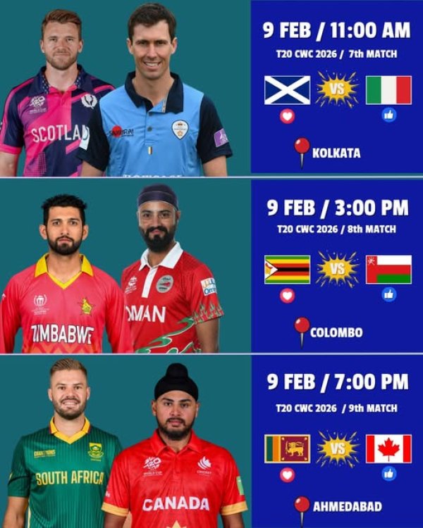 ICC मेन्स टी20 वर्ल्ड कप 2026 का रोमांच अपने चरम पर है। यह प्रतिष्ठित टूर्नामेंट भारत और श्रीलंका की संयुक्त मेज़बानी में आयोजित किया जा रहा है, जिसमें दुनिया भर की 20 टीमें हिस्सा ले रही हैं। आज यानी 9 फरवरी 2026 को टूर्नामेंट के ग्रुप चरण के तहत कुल तीन अहम मुकाबले खेले जाएंगे। ये मैच अलग-अलग शहरों और स्टेडियमों में आयोजित हो रहे हैं।