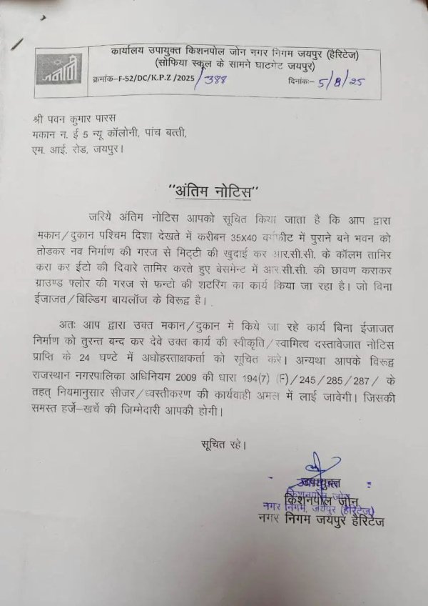छोटे मकानों पर त्वरित सीजर,लेकिन E5 पर जोन उपायुक्त बिजेंद्र सिंह की रहस्यमयी चुप्पी! जयपुर की न्यू कॉलोनी स्थित मकान नंबर E5 में बिना नगर निगम स्वीकृति के चल रहे बड़े पैमाने पर अवैध निर्माण ने नगर निगम किशनपोल ज़ोन की कार्यप्रणाली पर गंभीर सवाल खड़े कर दिए हैं। सबसे चौंकाने वाली बात यह है कि नगर निगम किशनपोल ज़ोन द्वारा दिनांक 5/8/2025 को इस निर्माणकर्ता को अंतिम नोटिस जारी किया जा चुका है, इसके बावजूद आज तक न तो सीजर कार्रवाई हुई और न ही निर्माण रोका गया।