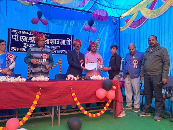 झाबुआ : नगर की शासकीय पीएम श्री विद्यालय में दिनांक २४ दिसंबर बुधवार को पुरस्कार वितरण एवं समापन समारोह का आयोजन गरिमामय वातावरण में सम्पन्न हुआ। कार्यक्रम का शुभारंभ प्रातः 11.00 बजे हुआ। सर्वप्रथम समस्त अतिथियों को प्राथमिक विभाग से स्काउट गाइड बैंड के साथ धूमधाम से आयोजन स्थल लाया गया । वही छात्र छात्राओं ने सभी अतिथियों का पुष्प वर्षा कर स्वागत किया।आयोजन के मुख्य अतिथि के रूप में देवेन्द्र कुमार ओझा (खण्ड शिक्षा अधिकारी, पेटलावद), विजेन्द्र कटारे (नायब तहसीलदार, उप तहसील झकनावदा) एवं श्रीमती रेखा गिरी (खण्ड स्त्रोत समन्वयक, पेटलावद), पालक संघ अध्यक्ष एफ सी माली पूर्व पालक संघ अध्यक्ष मांगीलाल चौधरी,ने माँ शारदा की फ़ोटो पर माल्यार्पण कर धूपद्वीप प्रज्ज्वलित कर आयोजन का विधिवत शुभारंभ किया। बाद संस्था द्वारा समस्त अतिथियों का साफा बांधकर पुष्पमाला पहनाकर स्वागत सत्कार किया।