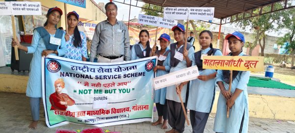 झालावाड़ : राष्ट्रीय सेवा योजना इकाई राजकीय उच्च माध्यमिक विद्यालय गोलाना में 7 दिवसीय शिविर के समापन दिवस पर परिन्डे बांधे गए, विधिवत प्रार्थना सत्र का आयोजन किया गया, सुनहरे सपनों की उड़ान में उज्जवल भविष्य का संदेश लिखकर चीलगाडी बनाकर आकाश की ओर उडाई, स्वच्छता और स्वदेशी रैली निकाली। समापन समारोह हेतु रंगोली बनाई, सभी दलों की भित्ति पत्रिका का प्रदर्शन किया है। पारम्परिक खेल 'घुघरा तौड़, पाली तौड़ ' खेल खेला गया। सम्भागियों से शिविर की व्यवस्थाओं पर प्रतिक्रिया ली गई। शिविर का संचालन एन एस एस सहप्रभारी वीरेन्द्र श्रृंगी एवं कार्यक्रम अधिकारी बुद्धिप्रकाश नागर ने भोजन व्यवस्था को सम्हाला। पवन नागर ने भी व्यवस्था सम्हाली। कार्यक्रम में पवन कुमार नागर, गिरधारी लाल गोचर, ओमप्रकाश यादव आदि स्टाफ बन्धुओं ने भाग लिया। सम्भागियों के लिए स्पेशल भोजन लड्डू, बाफले, पुलाव का भोजन बनाया गया। शिविर का समापन की घोषणा संस्था प्रधान पूरीलाल सुमन द्वारा की गई।