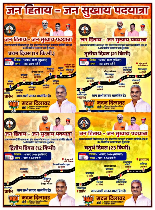 झालावाड़ - रामगंज मंडी के लोकप्रिय विधायक एवं राजस्थान सरकार में शिक्षा एवं पंचायती राज मंत्री श्री मदन दिलावर जी अपने विधानसभा क्षेत्र में “जनहिताय – जनसुखाय पदयात्रा” का शुभारंभ करने जा रहे हैं। यह पदयात्रा 13 मार्च से प्रारंभ होकर 16 मार्च को सम्पन्न होगी। चार दिवसीय इस जनसंपर्क पदयात्रा के दौरान मंत्री श्री मदन दिलावर लगभग 70 किलोमीटर पैदल यात्रा करेंगे। यह पदयात्रा रामगंज मंडी विधानसभा क्षेत्र के अंतर्गत लाडपुरा पंचायत समिति के ग्रामीण क्षेत्रों में निकाली जाएगी, जहां मंत्री श्री दिलावर गांव-गांव पहुंचकर देवतुल्य जनता से संवाद करेंगे।इस दौरान वे राज्य सरकार एवं केंद्र सरकार की जनकल्याणकारी योजनाओं से लाभान्वित हुई जनता से मिलेंगे, साथ ही आमजन की समस्याएं सुनकर उनके समाधान के लिए प्रयास करेंगे।