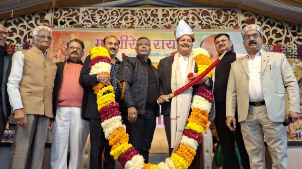कलचुरी कलवार समाज के राष्ट्रीय अध्यक्ष वीरेंद्र राय को फूल मालाओं के साथ चाँदी का मुकुट पहनाया