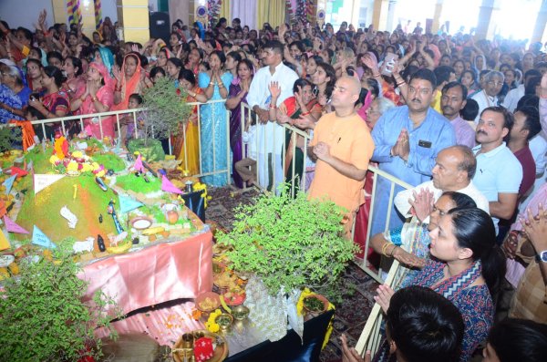गौ भक्त पियूष रावत ने गौ माता की महिमा बताई। भगवान ने स्वयं अपने मुख से बोला है कलयुग में गौ माता की भक्ति ही बैकुंठ का मार्ग दिखा सकती है और बैकुंठ ले जा सकती है। गौ माता यदि किसी का भाग्य यदि बदल सकती है तो गौ माता ही एक ऐसी शक्ति है जो सबके भाग बदल सकती है और आओ हम सब मिलकर गौ सेवा करें गोपालन करें ! हम सभी गौ माता से विश्व शांति का आशीर्वाद मांगा। संकीर्तन उपरांत विशाल भंडारा हुआ। इस्कॉन मंदिर में सुबह मंगला आरती हुई। अभिषेक व श्रृंगार किया गया। मंदिर के ब्रह्मचारी व्रज जन रंजन दास प्रभु ने गोवर्धन महाराज की कथा सुनाई और बताया की किस प्रकार भगवान् की शिक्षाओं के पालन से हम अपने जीवन में शांति ला सकते है । छप्पन भोग पश्चात भव्य महाआरती की गयी। श्रद्धालुओं ने हरिनाम संकीर्तन किया। बधाई गीत गाए। इसके पश्चात विशाल भंडारा हुआ। मंदिर में हजारों की संख्या में श्रद्धालुओं ने इस उत्सव का आनंद लिया मंदिर के उपाध्यक्ष व्रज जन रंजन दास ने बताया की कलियुग में केवल हरिनाम ही सभी प्रकार की समस्याओं का हल है। इस अवसर पर मंदिर के प्रमुख सहयोगी पीयूष- प्रियाता रावतअशोक सेठ ,डॉ अशोक गुप्ता, मनीष नीखरा ,,सुरेंद्र राय, महेश सर्राफ अजय अग्रवाल, करुणासिंधु दास,दामोदर बंधू दास, भक्त विपिन, भक्त विवेक, सुन्दर मोहन दास, प्रभात शर्मा एवं सभी भक्त गण आदि मौजूद रहे।सभी का आभार पीयूष रावत ने किया।