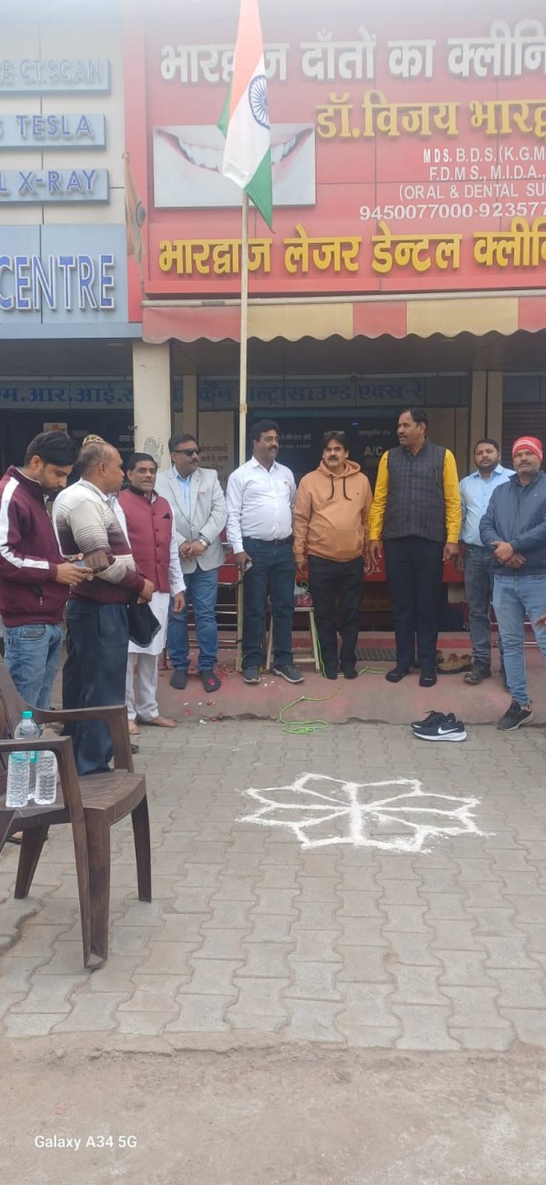 झांसी। मेडिकल व्यापार मंडल झांसी के पदाधिकारी गण एवं सदस्य गणों द्वारा व्यापार मंडल के कार्यालय पर गणतंत्र दिवस 26 जनवरी को बड़ी धूमधाम से मनाया 26 जनवरी 1950 को हमारा संविधान को लागू किया गया था बाबा भीमराव अंबेडकर की अध्यक्षता में संविधान सभा के सभी पदाधिकारी गण सदस्य गणों को नमन किया गया और संविधान के अनुसार देश का कानून देश की व्यवस्थाएं सब चलती हैं इसलिए हम सभी 26 जनवरी को गणतंत्र दिवस के रूप में मानते हैं और संविधान की वर्षगांठ मानते हैं आज गणतंत्र दिवस के पावन पुनीत अवसर पर मेडिकल व्यापार मंडल के अध्यक्ष डॉ विजय भारद्वाज महामंत्री शिरोमणि जैन एवं संगठन मंत्री बादाम सिंह यादव ने संयुक्त रूप से ध्वजारोहण किया उपाध्यक्ष सतीश गुप्ता ने सभी को गणतंत्र दिवस की बधाई दी संगठन के प्रवक्ता अरविंद भार्गव ने अपने ओजस्वी वक्तव्य में अमर शहीदों की याद दिलाते हुए उन्हें नमन किया लाल गुप्ता अनिल खरे ने सभी को संबोधित किया।