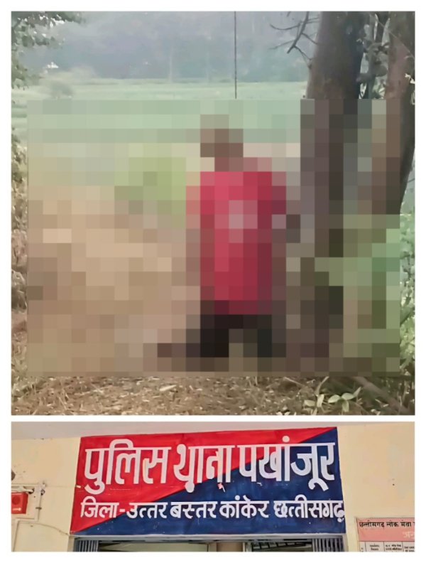 कांकेर - युवक ने फांसी लगाकर की आत्महत्या, FIR के डर से उठाया कदम कांकेर। जिले के पखांजूर थाना क्षेत्र अंतर्गत पी.वी. 27 ह्रदयपुर गाँव से सनसनीखेज मामला सामने आया है। गाँव के तालाब किनारे एक युवक का शव पेड़ से लटका हुआ मिला। घटना की सूचना ग्रामीणों ने तत्काल पुलिस को दी। मृत युवक की पहचान पुंनो मजुमदार के रूप में हुई है। बताया जा रहा है कि मृतक हाल ही में एक नाबालिक लड़की के भागने के मामले में संलिप्त था। इसी मामले में पुलिस द्वारा कार्रवाई और FIR दर्ज होने के डर से युवक ने आत्महत्या जैसा कदम उठाया। सूचना मिलते ही पखांजूर पुलिस मौके पर पहुँची और शव को अपने कब्जे में लेकर पंचनामा कार्यवाही की। फिलहाल पुलिस मामले की जांच में जुटी है।