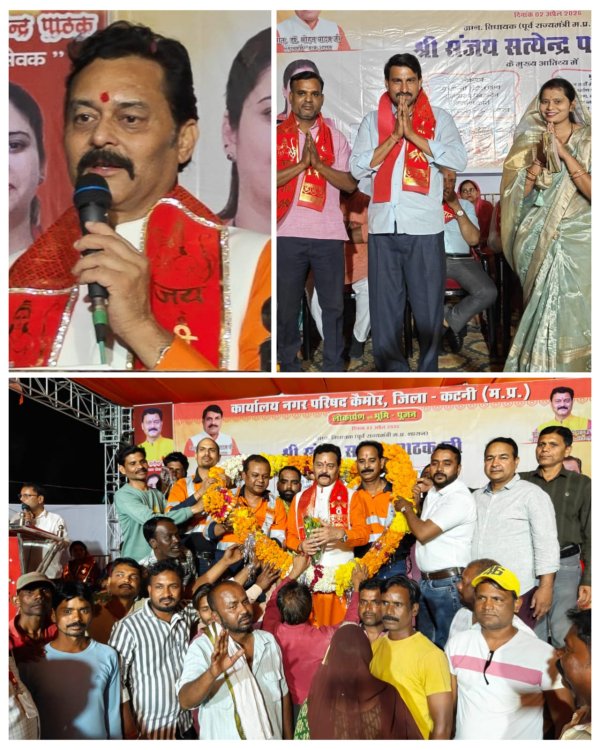 कटनी : विजयराघवगढ़ विधानसभा छेत्र अंतर्गत कैमोर नगर परिषद द्वारा आयोजित लोकार्पण एवं भूमि पूजन कार्यक्रम गुरुवार को भावविभोर वातावरण में सम्पन्न हुआ। कार्यक्रम में मुख्य अतिथि अध्यक्ष एवं विशिष्ट अतिथियों की गरिमामयी उपस्थिति में नगर विकास से जुड़े विभिन्न निर्माण कार्यों का लोकार्पण एवं भूमिपूजन किया गया।कार्यक्रम के दौरान फाउण्डेशन निर्माण कार्यों के साथ मुख्य सड़क चौड़ीकरण सौंदर्यीकरण सीसी रोड निर्माण नाली निर्माण एवं मरम्मत जैसे कार्यों की सौगात दी गई। लोकार्पण कार्य लगभग 15 लाख रुपए तथा भूमिपूजन कार्य लगभग 3 करोड़ रुपए की लागत से किए जाने की जानकारी दी गई।कार्यक्रम की शुरुआत मां सरस्वती पूजन एवं भगवान हनुमान की प्रतिमा के समक्ष दीप प्रज्वलन के साथ हुई। इसके पश्चात बजरंग बाल रामायण सेवा समाज कटनी के कलाकारों द्वारा हनुमान चालीसा पाठ एवं सांस्कृतिक प्रस्तुति दी गई जिसने पूरे माहौल को भक्तिमय बना दिया।मंचासीन कार्यक्रम के मुख्य अतिथि विधायक संजय सत्येंद्र पाठक का स्वागत सभी गणमान्य नागरिकों द्वारा भव्य रूप से किया गया। प्रमुख रूप से मनीष नावेद ने हनुमान जयंती की शुभकामनाएं देते हुए विधायक को विशाल गदा भेंट की। वहीं कैमोर के युवाओं ने मिलकर पुष्पों से बनी विशाल माला पहनाकर उनका आत्मीय सम्मान किया जिससे पूरा माहौल उत्साह और श्रद्धा से भर उठा।नगर परिषद अध्यक्ष पलक नमीत ग्रोवर ने अपने उद्बोधन में कहा कि नगर का विकास उनके द्वारा नहीं बल्कि उनके मार्गदर्शक विधायक संजय सत्येंद्र पाठक के नेतृत्व में संभव हो रहा है। उन्होंने कहा कि वे केवल उस विकास श्रृंखला को आगे बढ़ाने का कार्य कर रही हैं। पलक नमीत ग्रोवर ने भावुक होते हुए कहा कि संजू भैया हम सभी के लिए परिवार के सदस्य जैसे हैं किसी के भाई तो किसी के बेटे। उन्होंने यह भी उल्लेख किया कि विधायक स्वयं को जनसेवक मानते हैं और जनता की सेवा को सर्वोपरि रखते हैं। अपने संबोधन में नगर परिषद अध्यक्ष ने परिषद की विभिन्न जनकल्याणकारी योजनाओं की जानकारी दी और बताया कि मरीजों की सुविधा के लिए नगर परिषद द्वारा टोल नंबर के साथ एम्बुलेंस सेवा भी संचालित की जा रही है।पलक नमीत ग्रोवर के उद्बोधन से भावविभोर विधायक संजय सत्येंद्र पाठक ने कहा कि कैमोर नगर की तस्वीर अब पूरी तरह बदल चुकी है। उन्होंने कहा कि एक समय ऐसा था जब यहां सूनापन दिखाई देता था किन्तु पूर्व नगर परिषद अध्यक्ष मनीषा अजय शर्मा और वर्तमान अध्यक्ष पलक नमीत ग्रोवर के प्रयासों से नगर आज सुसज्जित और विकसित हो चुका है। उन्होंने एसीसी मैनेजमेंट द्वारा मिले सहयोग के लिए आभार व्यक्त किया तथा नगर विकास हेतु प्रस्तुत करोड़ों की मांगों को स्वीकृति प्रदान करने की 
