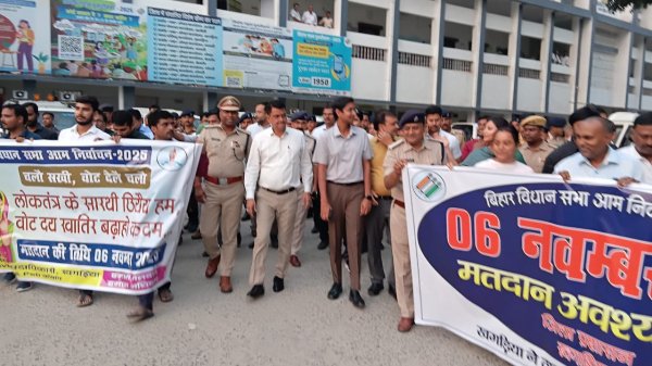 खगड़िया : बिहार विधान सभा आम निर्वाचन 2025 के सफल, शांतिपूर्ण एवं निष्पक्ष संचालन तथा मतदाता जागरूकता के उद्देश्य से आज जिला निर्वाचन पदाधिकारी-सह-जिलाधिकारी नवीन कुमार की अध्यक्षता में कलेक्ट्रेट परिसर, खगड़िया से एक विशाल फ्लैग मार्च निकाला गया। इस फ्लैग मार्च में पुलिस अधीक्षक राकेश कुमार, उप विकास आयुक्त, अपर समाहर्ता, अनुमंडल पदाधिकारी, तथा जिला स्तरीय सभी कोषांगों के नोडल पदाधिकारी सम्मिलित हुए। फ्लैग मार्च का मुख्य उद्देश्य आगामी 06 नवम्बर 2025 को जिले में होने वाले मतदान के प्रति आमजन को जागरूक करना एवं अधिकाधिक मतदाताओं को लोकतंत्र के इस महापर्व में सहभागिता के लिए प्रेरित करना था। फ्लैग मार्च के दौरान अधिकारियों ने आम नागरिकों से अपील की कि वे निर्भय होकर अपने मताधिकार का प्रयोग करें और शत-प्रतिशत मतदान सुनिश्चित करें।