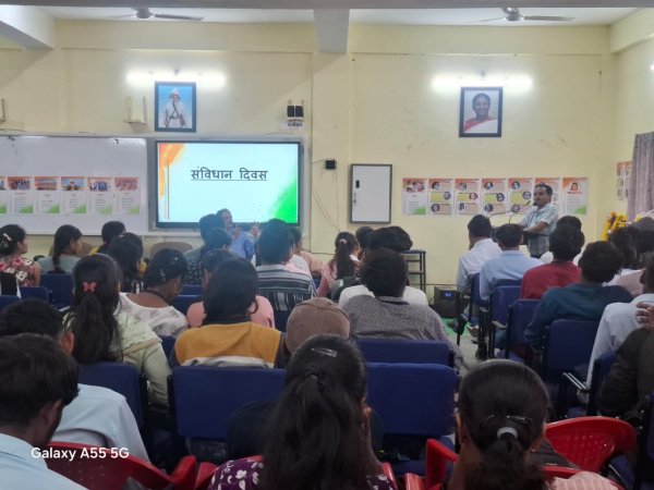 भीकनगांव : उच्च शिक्षा विभाग म.प्र शासन के निर्देशानुसार महाविद्यालय में भारतीय संविधान दिवस का आयोजन किया गया। यह आयोजन भारतीय ज्ञान परपंरा प्रकोष्ठ एवं राष्ट्रीय सेवा योजना के तत्वाधान में किया गया। इस अवसर पर संस्था प्राचार्य लक्ष्मण डावर ने अपने उद्बोधन में संविधान के विस्तृत स्वरूप एवं संविधान निर्माता डॉ.भीमराव अम्बेडकर के जीवन पर प्रकाश डाला। द्वितीय वक्ता प्रो. यजुवेन्द्र सिंह ने संविधान के महत्व पर चर्चा की एवं विद्यार्थियों को उनके मौलिक अधिकारो एवं कर्तव्यों के प्रति सजग किया। इसी क्रम में महाविद्यालय से प्रो.दिपक बडोले ने संविधान के निर्माण की प्रक्रिया को बताया। महाविद्यालय के डॉ.एम.एल.मोरे ने मध्यप्रदेश के डॉ.हरि सिंह गौर के संविधान सभा में योगदान को याद किया। इस कार्यक्रम के समापन में संविधान की प्रस्तावना का सामूहिक वाचन एवं प्रश्न मंच प्रतियोगिता का आयोजन किया। कार्यक्रम में अजीम प्रेमजी फाउंडेशन द्वारा प्रदर्शनी लगाई गई। इस कार्यक्रम में महाविद्यालय का समस्त स्टॉफ एवं विद्यार्थी उपस्थित रहे। कार्यक्रम का संचालन प्रो.शक्ति चौहान एवं आभार प्रदर्शन रासेयो प्रभारी प्रो.सुरेश डोडवे द्वारा माना गया।