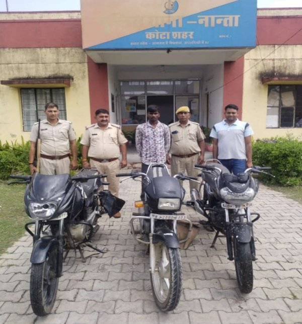 कोटा : शहर पुलिस अधीक्षक तेजस्वनी गौत्तम ने बताया कि वाहन चोरी की घटनाओं पर अंकुश लगाने एवं वाहन चोरो की गिरफ्तारी हेतु समस्त थानाधिकारीयों को निर्देश दिये गये थे। इसी क्रम में दिलीप सैनी अतिरिक्त पुलिस अधीक्षक के निर्देशन मे गंगासहाय शर्मा वृत्ताधिकारी वृत केन्द्रीय कोटा शहर के सुपरविजन मे थानाधिकारी थाना नान्ता नवल किशोर शर्मा उप निरीक्षक के नेतृत्व में टीम का गठन किया गया। टीम द्वारा 04 अक्टूबर को मुबखीर की सूचना पर अभियुक्त पवन जोगी को पानी की टंकी पत्थर मण्डी नान्ता से चोरी की मोटरसाईकिल सहित गिरफ्तार किया। अभियुक्त चोरी की मोटरसाईकिल को बेचने की फिराक में था। जिससे गहनता से अनुसंधान करने पर दो अन्य चोरी की मोटरसाईकिले भी बरामद की गई है।