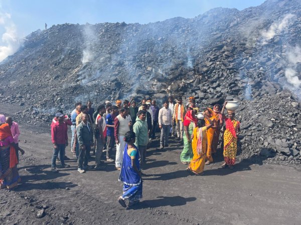बालूमाथ :  बालूमाथ प्रखंड क्षेत्र में सीसीएल द्वारा संचालित तेतरियाखांड के विस्थापित ग्रामीण जलते कोयले के प्रदूषण से परेशान होकर बाल्टी और डेकची में पानी भरकर कोलियरी परिसर पहुचे और कोयले की आग को बुझाने का प्रयास किया। मौके पर बोलते हुए विस्थापित नेता सुरेश उरांव, संतोष यादव ने बताया कि तेतरियाखांड कोलियरी में वर्तमान में सीसीएल द्वारा आठ लाख टन कोयला का स्टॉक जमा कर दिया है। जिसमे भीषण आग लगी हुई है। जिसे बुझाने में सीसीएल प्रबंधन फेल है। वही जल रहे कोयले से जहरीला धुंआ कार्बनडाइऑक्साइड निकल रहा है। जिसकी चपेट में स्थानीय ग्रामीण आकर बीमार पड़ रहे हैं। इस कारण हमलोग महिला-पुरूष साथ मिलकर जल रहे कोयला स्टॉक को बाल्टी एवं डेकची में पानी भरकर कोयले की आग को बुझाने का प्रयास कर रहे है। वही सीसीएल द्वारा विस्थापितों का कई एकड़ का नौकरी मुआवजा बाकी है। सीसीएल खुले 30 वर्षो से अधिक हो गया लेकिन अब तक नौकरी नहीं दिया गया है। अगर सीसीएल उपरोक्त मामले में कोई पहल नही करता है तो आगे उग्र आंदोलन करेंगे। मौके पर कृष्णा साव,जगरनाथ यादव,अजय चौधरी,भुनेश्वर यादव,दिवाली राम, सूरज साव, संतोष यादव, गीता देवी, पूनम देवी, सीमा देवी, रूबी देवी, सरिता देवी, समेत कई लोग उपस्थित थे।