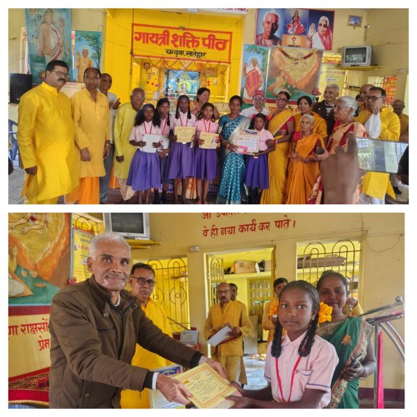 लातेहार - चंदवा भारतीय संस्कृति ज्ञान परीक्षा के माध्यम से बच्चों में भारतीय संस्कृति के आदर्श जीवन मूल्यों का विकास हो रहा है। लातेहार जिला चंदवा स्थित गायत्री शक्तिपीठ परिसर मे भारतीय संस्कृति ज्ञान परीक्षा के जिला स्तरीय सम्मान समारोह का हुआ आयोजन ।इस सम्मान समारोह मे मुख्य अतिथि के रूप मे मुख्य ट्रस्टी लाल प्रदीप नाथ साहदेव,विशिष्ट अतिथि राजेश चंद्र पांडेय,शांता सिन्हा,लव कुमार तिवारी उपस्थित रहे। अतिथियों सहित भारतीय संस्कृति ज्ञान परीक्षा के जिला संयोजक संतोष कुमार सिन्हा,कोषाध्यक्ष देवेन्द्र प्रसाद ने वेद माता गायत्री,परम पूज्य गुरुदेव श्रीराम शर्मा आचार्य,माता भगवती देवी शर्मा आचार्य की पूजा अर्चना कर दीप प्रज्ज्वलित कर एवं पुष्प अर्पित कर कार्यक्रम का शुभारंभ किया। वेद मंत्रोच्चार के साथ विधिवत पूजा अर्चना की। लातेहार जिला के बालूमाथ बारियातू,चंदवा,लातेहार,मनिका,बरवाडीह सहित सभी 38 स्कूलों के में आयोजित कराएं भारतीय संस्कृति ज्ञान परीक्षा के सभी 3500 छात्र,छात्राओं,सभी विद्यालयों के प्राचार्यों और अभिभावकों ने कार्यक्रम मे अपना उपस्थिति दर्ज कराया।