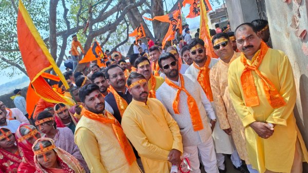 बालूमाथ : बालूमाथ प्रखंड क्षेत्र के नगड़ा ग्राम में आयोजित सप्तदिवसीय श्री रुद्र महायज्ञ के शुभारंभ को लेकर शुक्रवार को भव्य कलश यात्रा निकाली गई। बैंड-बाजे की धुन पर निकली इस कलश यात्रा में सैकड़ों महिलाओं ने सिर पर कलश रखकर “हर-हर महादेव” के जयकारों के साथ पूरे वातावरण को भक्तिमय बना दिया।कलश यात्रा नगड़ा गांव से निकलकर जरी नदी से कलश में जल भरा गया। इसके बाद श्रद्धालु पुनः यज्ञ स्थल पहुंचे। इस दौरान पूर्व मंत्री बैजनाथ राम भी कलश यात्रा में शामिल हुए। उन्होंने कहा कि इस प्रकार के धार्मिक आयोजन से क्षेत्र मे सकारात्मक ऊर्जा का संचार होता है कार्यक्रम में पूजा समिति के अध्यक्ष संजय यादव, गंगेश्वर यादव, बिहारी यादव, भाजपा मंडल अध्यक्ष अखिलेश भोक्ता,उपेंद्र रंगीला,राजेंद्र साव, संतोष यादव,मनोज यादव, प्रदीप यादव,सुदामा प्रसाद, राजन यादव,रौशन यादव,दीपक दशरथ यादव अभिषेक यादव कृष्ण यादव अमित यादव बिगन यादव सतपाल यादव अशोक यादव,योगेश्वर यादव,राजेंद्र प्रसाद,शंकर साव कई श्रद्धालु उपस्थित रहे।