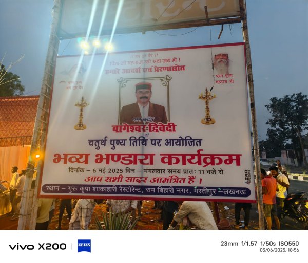 लखनऊ : मंगलवार के दिन मोहनलालगंज में मस्तीपुर के राम बिहारी नगर स्थित गुरु कृपा शाकाहारी रेस्टोरेन्ट में परम श्रद्धेय बागेश्वर द्विवेदी की चतुर्थ पुण्य तिथि पर भव्य भण्डारा कार्यक्रम का आयोजन किया गया। इस दौरान बागेश्वर द्विवेदी की चतुर्थ पुण्य तिथि पर भव्य भण्डारा कार्यक्रम में जिला पंचायत सदस्य अमरेंद्र भारद्वाज, प्रधान मस्तीपुर सूर्य कुमार द्विवेदी, कांग्रेस नेता बब्लू सिंह, समेत अन्य कई सम्मानित जन कार्यक्रम में सम्मिलित हुए। इस अवसर पर मोहनलालगंज से पत्रकार टीम के अध्यक्ष धीरज तिवारी व उनकी पूरी टीम ने मौके पर उपस्थित होकर प्रसाद ग्रहण किया।