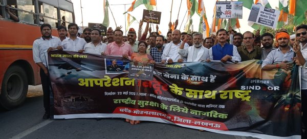 मोहनलालगंज : मोहनलालगंज में शुक्रवार के दिन भाजपा पार्टी से मण्डल अध्यक्ष बेटू के नेतृत्व में भारतीय सेना के शौर्य व ऑपरेशन सिंदूर की सफलता के लिए कस्बा में निकाली विशाल तिरंगा यात्रा इस दौरान यात्रा में मण्डल अध्यक्ष बेटू सिंह ब्लॉक प्रमुख ओमप्रकाश शुक्ला प्रधान संघ अध्यक्ष देवेंद्र सिंह सहित पूर्व विधायक चंद्रा रावत, भाजपा नेता हंसराज रावत, भाजपा नेता अंकुर अवस्थी, मोचन शर्मा, गुड्डू सिंह भाजपा नेता,सुशील रावत समेत काफी संख्या भाजपा कार्यकर्ता व स्थानीय लोग लोग यात्रा में शामिल रहे। इस दौरान यातायात व्यवस्था को बेहतर तरीके से संचालित करवाने और तिरंगा यात्रा को सुरक्षित निकलवाने में मोहनलालगंज थाना प्रभारी दिलेश कुमार सिंह व कस्बा चौकी इंचार्ज बीर बहादुर दुबे, दरोगा अतुल सिंह, दरोगा रजनीश चौरसिया, दरोगा आंनद अम्बेडकर, कांस्टेबल विकास जयसवाल, कांस्टेबल जितेंद्र कुमार सहित पूरी पुलिस टीम डटी रही।