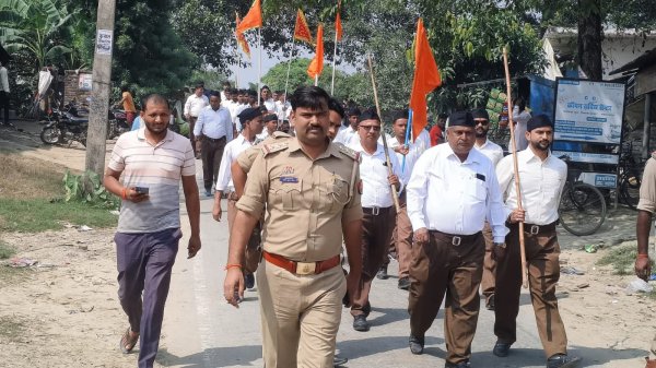 महाराजगंज - में राष्ट्रीय स्वयंसेवक संघ (आरएसएस) के शताब्दी वर्ष के उपलक्ष्य में रविवार को सिसवा बाजार में भव्य पथ संचलन का आयोजन किया गया। कार्यक्रम का शुभारंभ श्रीराम जानकी मंदिर परिसर से हुआ। स्वयंसेवकों का अनुशासित दल नगर के प्रमुख मार्गों — अमरपुरवा, गोपालनगर, मिस्कारी टोला, रोडवेज बस स्टैंड,रेलवे स्टेशन,शायरस्थान चौक, नौकाटोला और इस्टेट चौक — से होते हुए पुनः प्रारंभिक स्थल पर पहुंचा। मुख्य अतिथि जिला प्रचारक विनय ने संबोधित करते हुए कहा कि राष्ट्रीय स्वयंसेवक संघ देश की एकता, अखंडता और सामाजिक समरसता के लिए निरंतर कार्यरत है। संघ ने अपने 100 वर्षों के इतिहास में लाखों स्वयंसेवकों को राष्ट्रसेवा के लिए तैयार किया है। आज संघ पर्यावरण संरक्षण, परिवार संवर्धन और समाज एकीकरण के भाव से आगे बढ़ रहा है। पथ संचलन के दौरान मिस्कारी टोला में मुस्लिम समुदाय के युवाओं ने स्वयंसेवकों पर पुष्पवर्षा कर सामाजिक सौहार्द की अनूठी मिसाल प्रस्तुत की। कार्यक्रम के दौरान सुरक्षा व्यवस्था के दृष्टिकोण से एसडीएम सिद्धार्थ गुप्ता,सीओ शिवप्रताप सिंह,प्रभारी निरीक्षक धर्मेंद्र सिंह,चौकी प्रभारी उमाकांत सरोज,महिला-पुरुष एसआई,एलआईयू के विमलेश तथा पीएसी के जवान मुस्तैद रहे। इस अवसर पर नगर कार्यवाह अमित पूरी, नगर संचालक मोहन अग्रवाल,अरविंद आचार्य,नागेन्द्र मल्ल,अमरनाथ खरवार,निरंकार सिंह,शिवकुमार सिंह,योगेश जायसवाल, कौशलेंद्र सिंह, दयाशंकर सिंह,धर्मनाथ खरवार,श्रीराम शाही,मनीष पांडेय,आशुतोष भालोटिया,सोनू जायसवाल,अभिमन्यु चौरसिया सहित सैकड़ों स्वयंसेवक उपस्थित रहे।