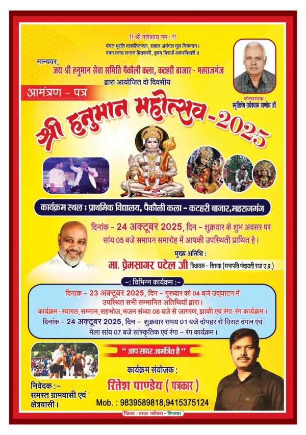 आप सभी हनुमान महोत्सव पैकोली कला के इस भव्य कार्यक्रम में उपस्थित होकर मेला दंगल और सांस्कृतिक कार्यक्रम का सफल बनाए ।