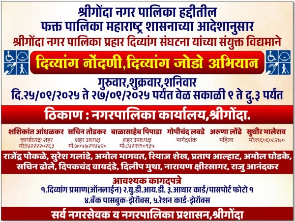 अहिल्यानगर : महाराष्ट्र सरकार के आदेशानुसार श्रीगोंदा नगर पालिका और प्रहार विकलांग संगठन के संयुक्त प्रयास से विकलांग पंजीकरण एवं विकलांग जोड़ो अभियान” आयोजित किया जा रहा है। यह अभियान गुरुवार, शुक्रवार और शनिवार, 25 सितंबर 2025 से 27 सितंबर 2025 तक चलेगा और रोजाना सुबह 9 बजे से दोपहर 3 बजे तक नगर पालिका कार्यालय, श्रीगोंदा में आयोजित किया जाएगा।