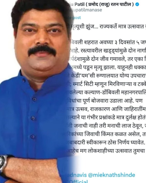 ठाणे : नागरिकों की मौत से हाहाकार… शासक वर्ग फिर भी उत्सव में मग्न! तीन दिनों में पाँच मौतें – नेता नवरात्रि उत्सव में व्यस्त, पूर्व विधायक राजू पाटिल का तंज कल्याण-डोंबिवली शहर में महज़ तीन दिनों के भीतर पाँच नागरिकों की मौत हो गई है। सड़क पर बने गड्ढों के कारण दो लोगों की जान चली गई। साँप के काटने से दो लोगों की मृत्यु हुई। एक मासूम बच्चा चेंबर में गिरने से काल के गाल में समा गया। इससे भी अधिक चौंकाने वाली बात यह है कि केडीएमसी अस्पताल में उचित इलाज की कोई व्यवस्था नहीं है। जिस कल्याण-डोंबिवली महानगरपालिका को स्मार्ट सिटी के रूप में प्रचारित किया जाता है, वहाँ बुनियादी सुविधाओं का पूरी तरह बुरा हाल है। पूर्व विधायक प्रमोद (राजू) रतन पाटिल ने आरोप लगाया कि शासक वर्ग नागरिकों की समस्याओं से मुँह मोड़कर केवल उत्सव, राजनीति और विज्ञापनों में व्यस्त है।