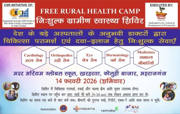 10 बजे से शुरू किया जाएगा ।स्वास्थ्य शिविर में देश के बड़े अस्पताल मेदान्ता गुड़गांव एम्स के अनुभवी डाक्टरों द्वारा चिकित्सा परामर्श एंव दवा इलाज हेतु नि:शुल्क सेवाए दी जाएगी। साथ ही हृदय रोग, हड्डी रोग, नेत्र रोग, चर्म रोग और सामान्य बीमारियों का इलाज किया जाएगा। इस सम्बन्ध में मैनेजर ई0 समीर अधमी ने बताया की