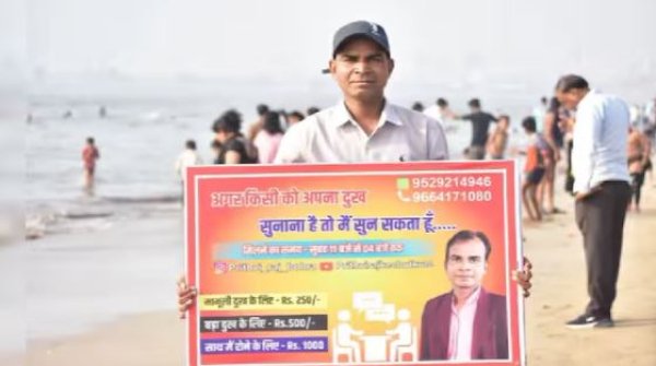 मुंबई के एक बीच पर एक ऐसा नज़ारा देखने को मिला, जिसने सोशल मीडिया पर लोगों का ध्यान खींच लिया। यहाँ एक शख्स लोगों की परेशानियों को सुनने के बदले पैसे ले रहा है। वायरल वीडियो में वह पोस्टर लेकर खड़ा दिखाई देता है, जिस पर लिखा है: “अगर आपको कोई अपनी तकलीफ़ सुनाना है, मैं सुनने के लिए तैयार हूँ।”