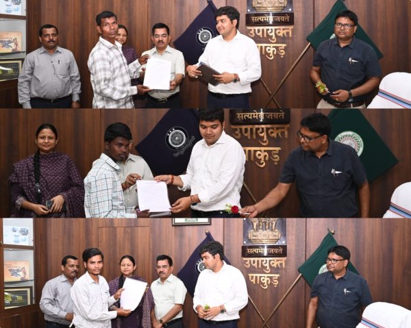 पाकुड़ - समाहरणालय स्थित उपायुक्त कार्यालय प्रकोष्ठ में मृत सरकारी सेवकों के आश्रितों को अनुकम्पा के आधार पर नियुक्ति पत्र प्रदान किए गए, इस अवसर पर उपायुक्त मनीष कुमार ने चयनित अभ्यर्थियों को व्यक्तिगत रूप से नियुक्ति पत्र सौंपते हुए उन्हें नई जिम्मेदारियों के लिए शुभकामनाएँ दीं. दिनांक 12 मार्च 2026 को आयोजित जिला अनुकम्पा समिति की बैठक में की गई अनुशंसा के आलोक में कुल 3 आश्रित अभ्यर्थियों को नियुक्ति प्रदान की गई।समाहरणालय संवर्ग के अंतर्गत अनुसेवक के पद पर दिनेश किस्कू, सनत कुमार माल एवं देवीधन मोहली को नियुक्ति पत्र सौंपा गया।