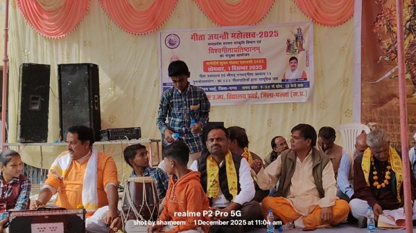 पवई : गीता जयंती के अवसर पर पवई स्थित छत्रसाल स्टेडियम आध्यात्मिक वातावरण से सराबोर रहा मध्य प्रदेश शासन के संस्कृति विभाग एवं विश्व गीता प्रतिष्ठानम् के संयुक्त तत्वावधान में श्रीमद्भगवद्गीता के अध्याय 15 – पुरुषोत्तम योग का भव्य सामूहिक पाठ आयोजित किया गया,सर्व प्रथम दीप प्रज्वलित कर सरस्वती जी का पूजन वंदना की महापुराण गीता का पूजन वंदना आरती प्रसाद वितरण किया गया तत्पश्चात गीता के श्लोक का वाचन किया गया जिसमें सांदीपनि विद्यालय सहित क्षेत्र जाने माने वेदाचार्य ब्राह्मण व सभी धर्म के हजारों की जनसंख्या में लोग शामिल हुए अनेक शैक्षणिक संस्थानों के छात्र छात्राओं ने उत्साहपूर्वक सहभागिता की आयोजन में सैकड़ों छात्र-छात्राओं,शिक्षकों, आचार्यगणों सामाजिक प्रतिनिधियों तथा नगर एवं क्षेत्र के प्रबुद्ध नागरिकों ने एक स्वर में गीता के पवित्र श्लोकों का उच्चारण किया, जिससे पूरा स्टेडियम दिव्य ध्वनियों से गूंज उठा सामूहिक गीता वादन के उपरांत विधिवत आरती भी की गई, जिसने पूरे वातावरण को भक्तिमय बना दिया आयोजकों के अनुसार यह कार्यक्रम न केवल आध्यात्मिक चेतना जागृत करने का माध्यम बना, बल्कि युवाओं में भारतीय संस्कृति और परंपराओं के प्रति गर्व की भावना सुदृढ़ करने का भी उद्देश्य रखता है कार्यक्रम के दौरान आचार्यों ने अपने-अपने गीता अध्यायों पर प्रकाश डालते हुए गीता के जीवनोपयोगी संदेशों को उपस्थित जनसमूह के समक्ष प्रस्तुत किया ।